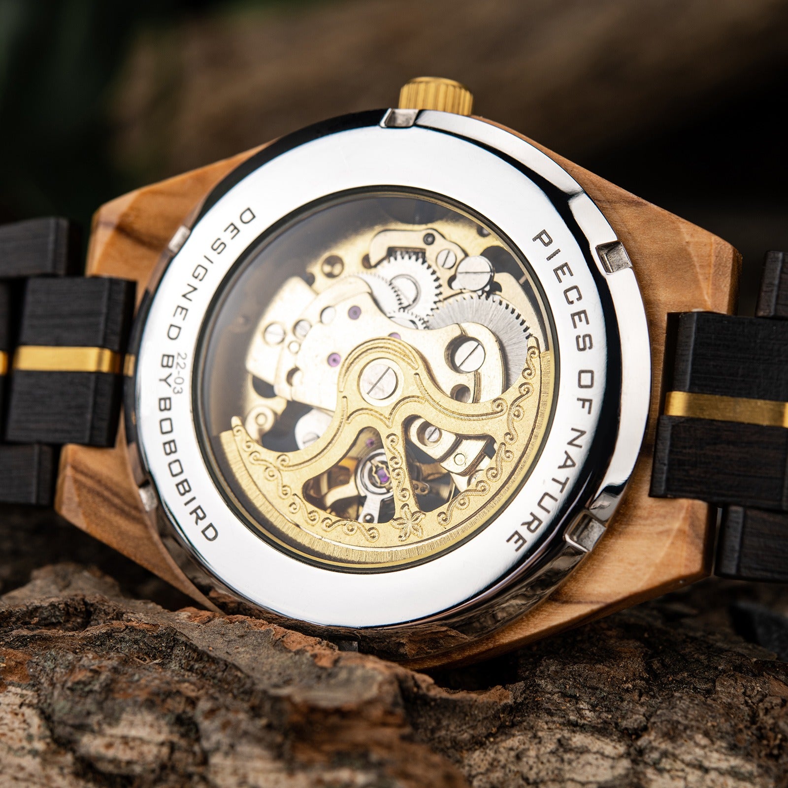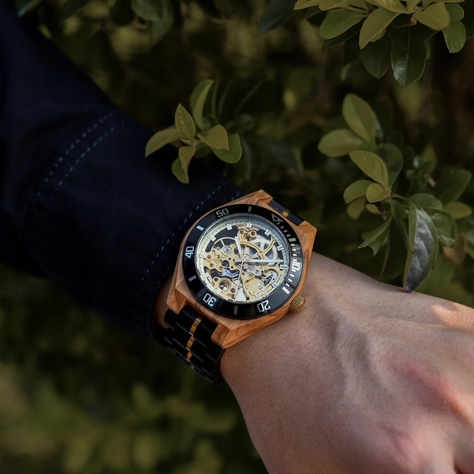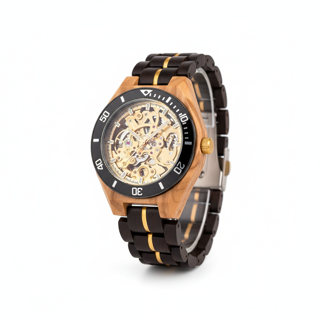 The watch combines natural wood (African Blackwood + Red Sandalwood) with stainless steel details for durability.